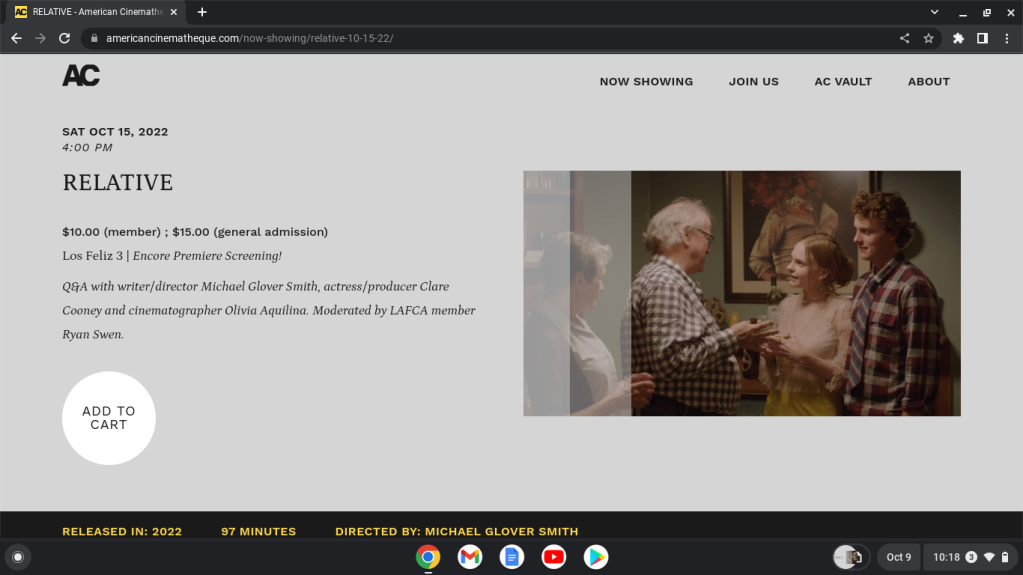 I’m pleased to announce that, due to brisk ticket sales, the American Cinematheque / Los Feliz 3 has added an encore screening of RELATIVE next weekend. It will occur one day after our L.A. Premiere, on Saturday, October 15 at 4:00 pm, and be followed by a Q&A with me, actress/producer Clare Cooney and director of photography Olivia Aquilina, moderated by critic Ryan Swen. You can buy tickets in advance here: https://www.americancinematheque.com/now-showing/relative-10-15-22/